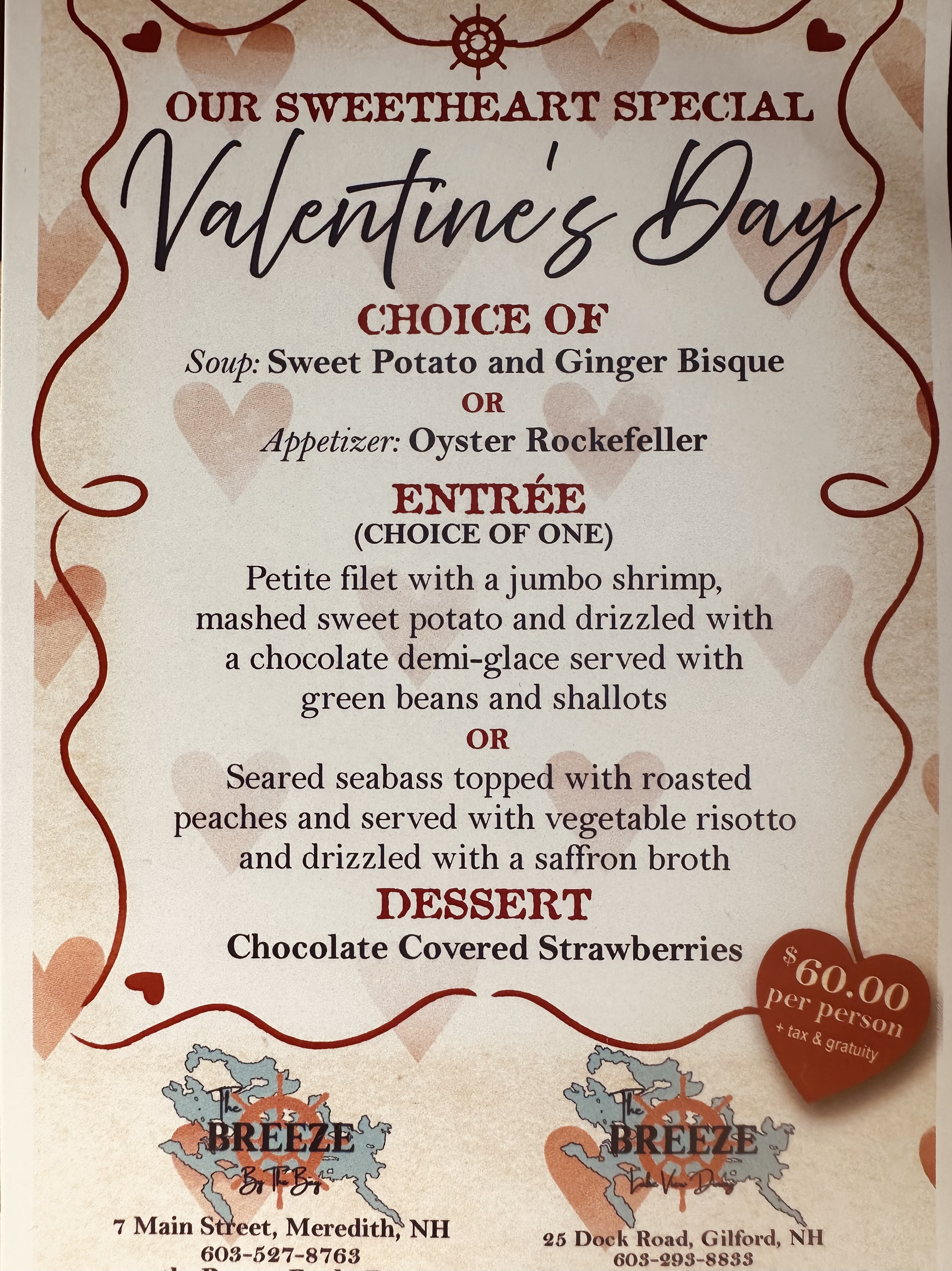 Join us for Valentines Day. Select off our featured Sweetheart Menu or from our daily menu.